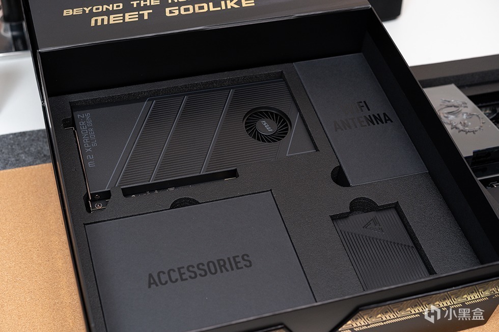 上翻联动式的开启方式,包装为上下两层结构,上层为主板本体,嵌入在厚重的定型硬海绵中。下层为独立放置的配件盒、WIFI天线、M.2 XPANDER-ZSLIDER GENS 扩展卡和EZ Control Hub。