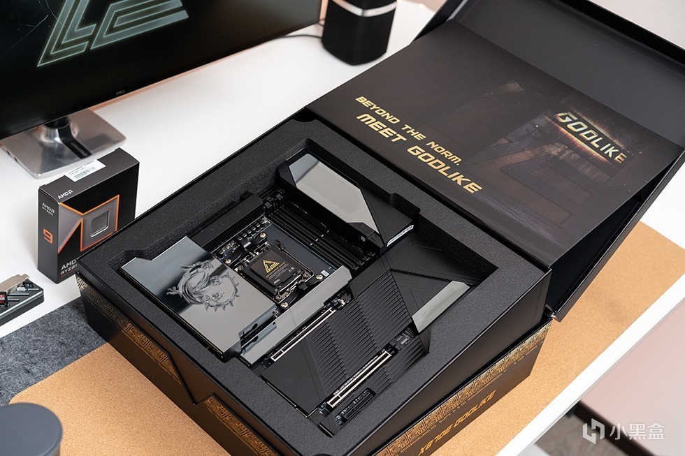 微星 MEG X870E GODLIKE 超神包装主打一个“大”和“重”的特点,外观上采用MEG系列独有的黑金奢华配色,正面是硕大的产品渲染图,独有的疼金“MEG X870E GODLIKE”字样,无时无刻不在提醒玩家这是一款顶级旗舰型号主板,包装的背面则是各项主要硬件规格的说明。