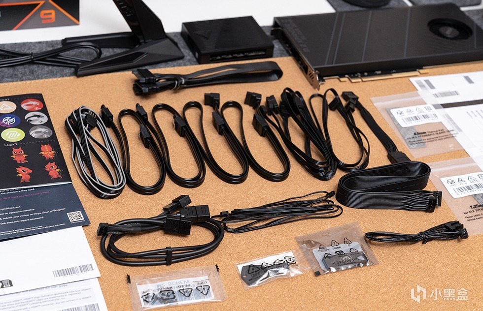 附件盒里包含了1份快速安装指南、1份关于欧盟规管的文件、1张微星信仰标签贴纸、1份 MSI SHOUTOUT 活动的介绍、1个驱动U盘、一套、1个EZ M.2 Clip II 扳手、2片SSD散热垫、4 根 SATA 线、1 根 RGB 4-PIN 扩展线、1 根 ARGB 一分三线、1 根 RGB 一分二线、1 根 风扇PWM供电灯光USB三合一扩展线,1 根 EZ FRONT PANEL 前面板延长线,2 条2-PIN 的温度探测线材、M.2扩展卡以及EZ Control Hub配套线材。