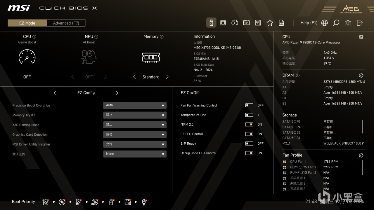 微星MEG X870E GODLIKE超神主板搭载的是最新的CLCIK BIOS X,采用了新ESA架构设计,优化后的UI在易用性和美观度上都有了大幅提升,特别是在EZ模式下,能简单快捷地找到想要的功能选项并解决问题,对小白用户特别友好。EZ Config将最常用的PBO超频、Memory Try It、X3D Gaming Mode等常用功能直接放在最显眼的位置,不需要再进入高级设计的多级菜单进行设置。EZ On/Off将一些小功能直接设计为ON/OFF开关选项,更为直观。