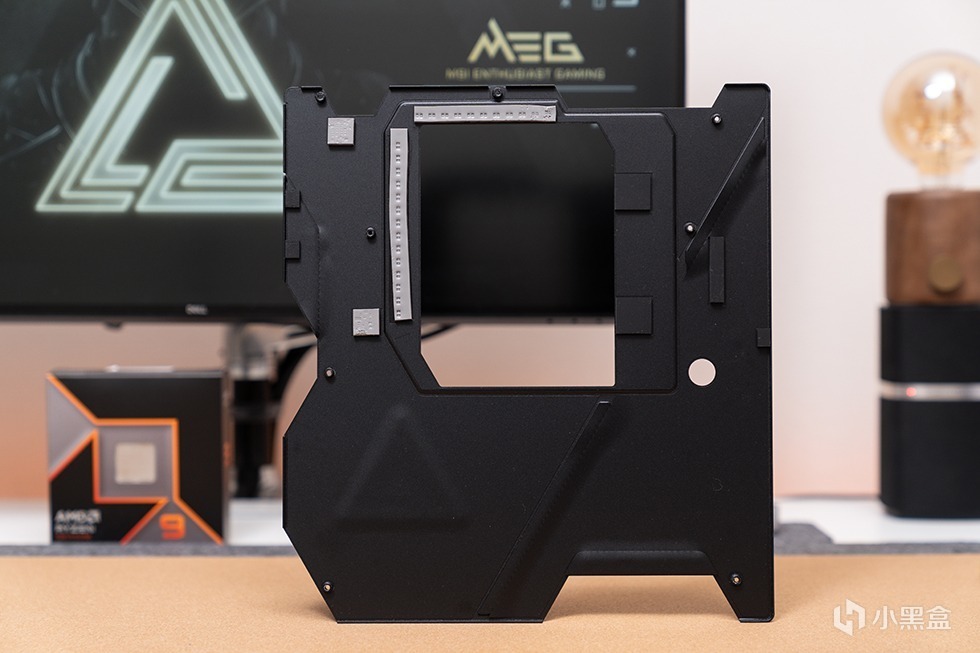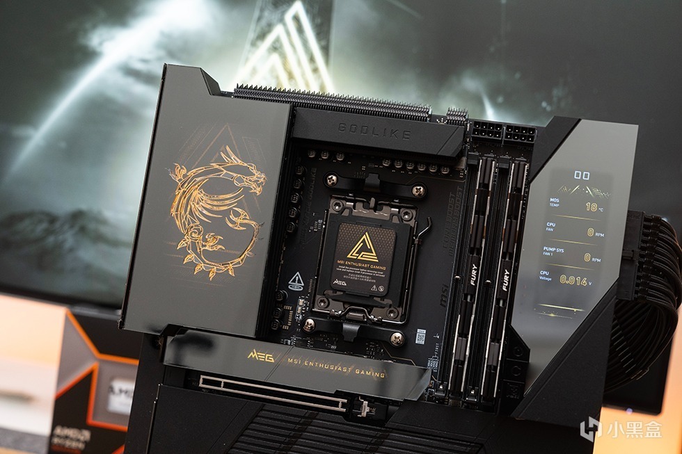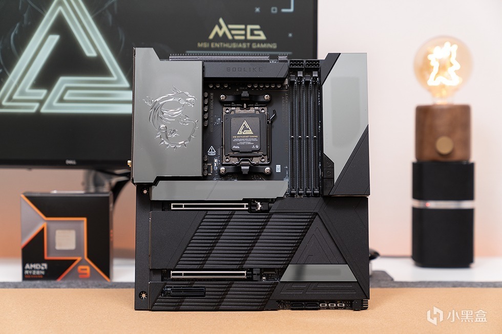 微星MEG X870E GODLIKE超神主板采用E-ATX板型,除了CPU和内存差插槽位置以外,做到了黑色金属散热装甲全覆盖,装甲采用哑光磨砂处理工艺,没有过多的装饰线条,仅搭配VRM散热模组上盖、M.2_1散热装甲、芯片组散热装甲以及动态仪表板上的镜面玻璃,整体稳重大气且不失科技感。
