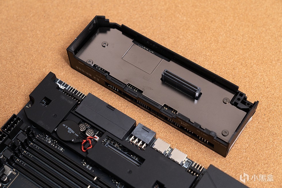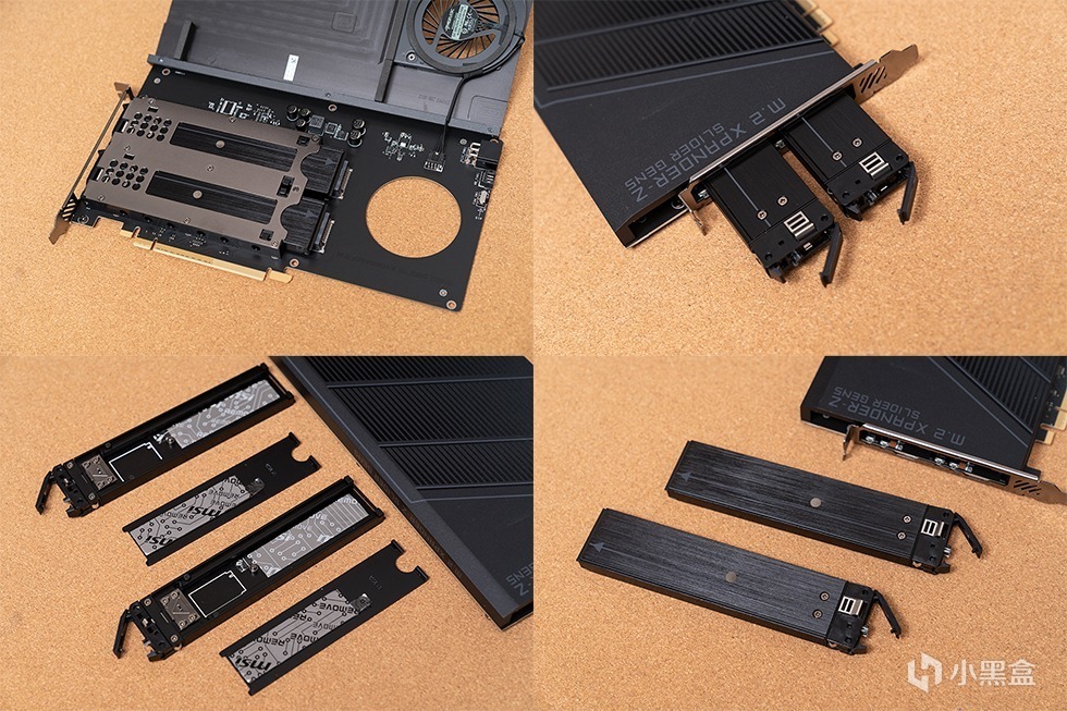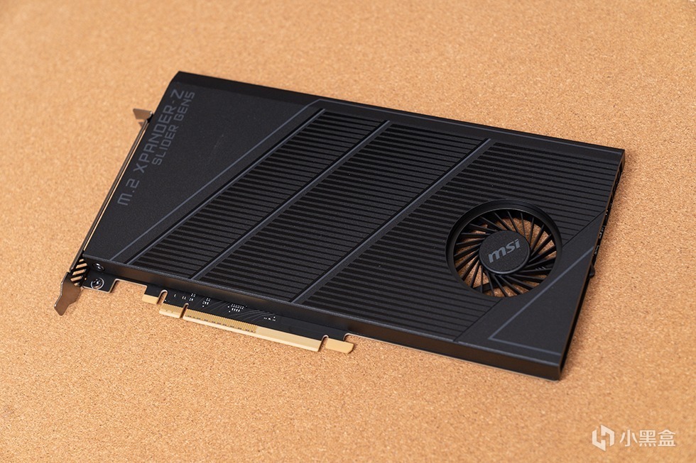 除了板载的M.2槽位以外,附件中还带有一块M.2 XPANDER-Z SLIDER GEN5 扩充卡,单一插槽设计,配备双高速Gen5 M.2 插槽,采用EZ 抽拉计,外观覆盖铝合金散热片,并配合一个7cm风扇进行辅助散热,满足用户的高速存储需求。