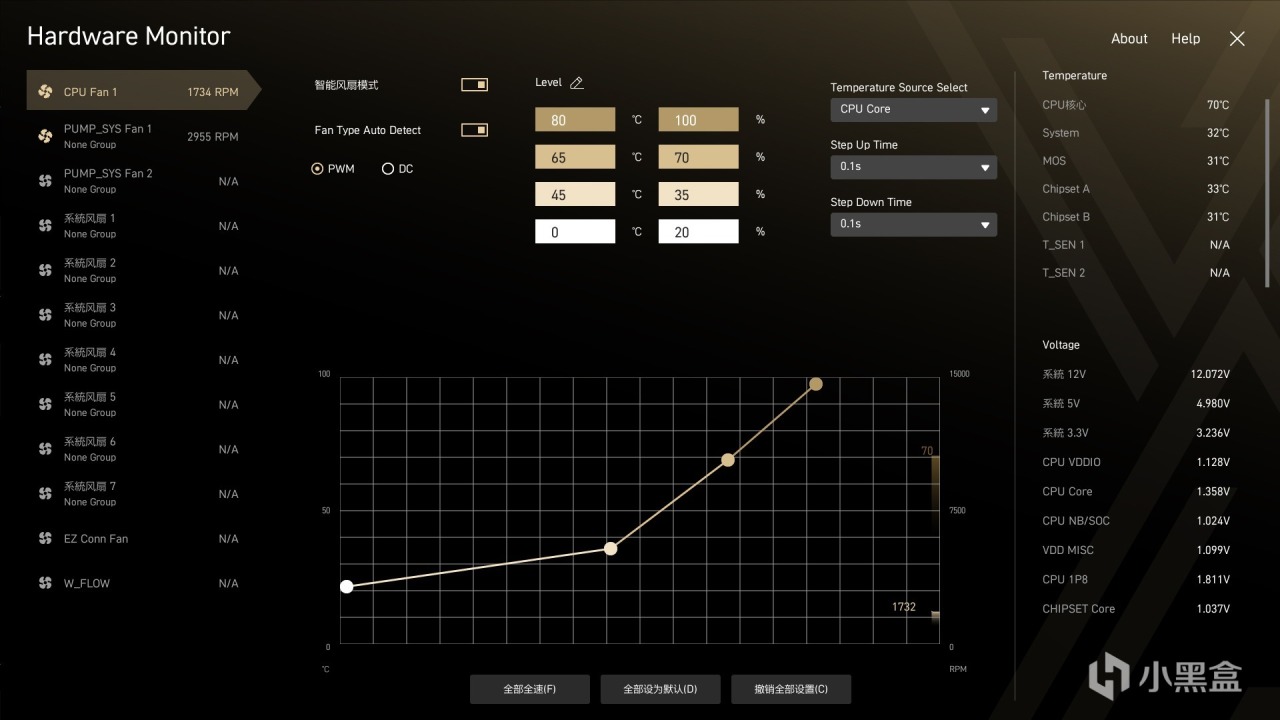 风扇控制选项页面也做了全新调整,提供了多种转速配置,用户可以根据自身的实际使用情况进行选择,当然也可以手动调节转速曲线。