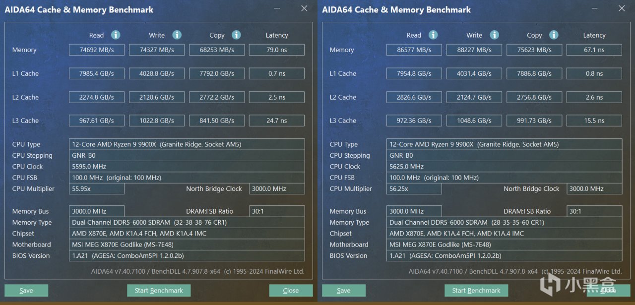 从实测成绩可以看到,左侧为默认状态(时序32-38-38-76),High-Efficiency和Latency Killer关闭。右侧为开启Optimized Platform Profile,时序降到(28-35-35-60), Latency Killer、High-Efficiency开启,Tighest模式。读写速度提升15%以上,延时从79ns降低到67.1ns,性能提升十分明显。