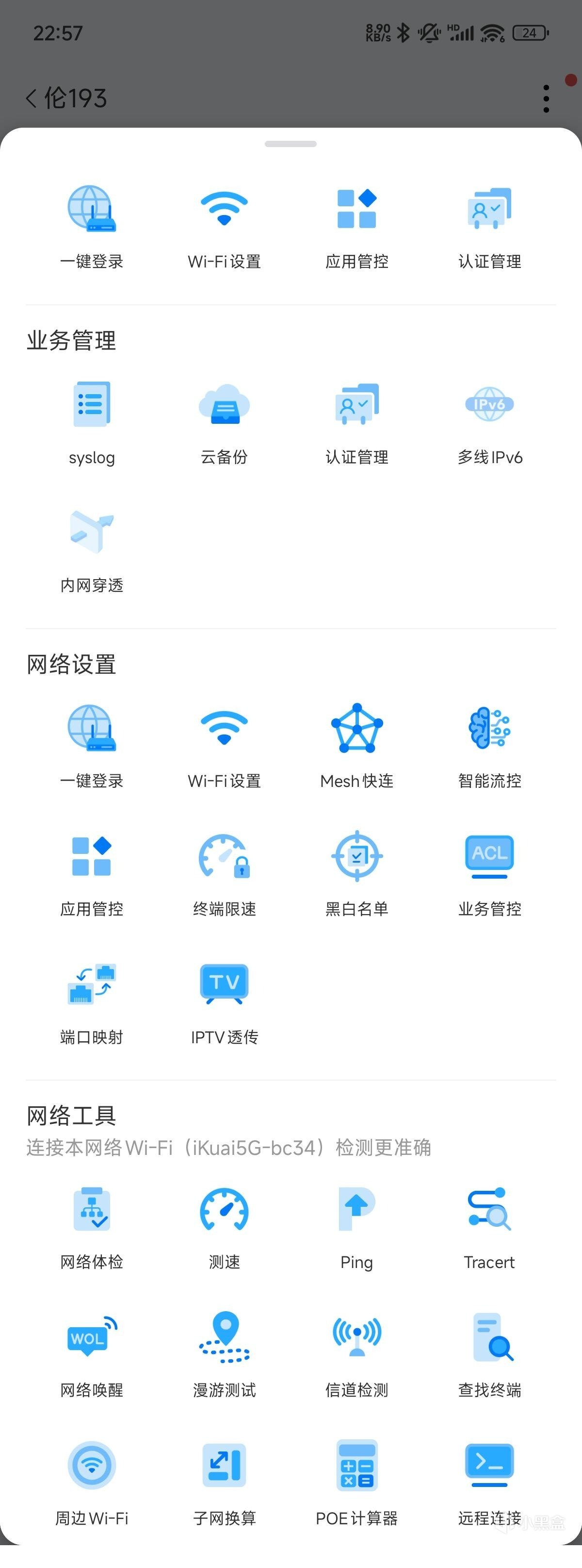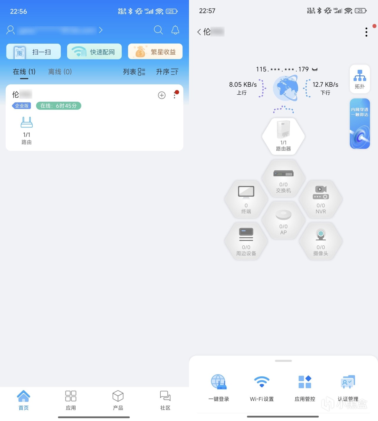 作为主要面向企业的网络管理App,爱快e云首页会显示当前账号绑定的设备列表——这与大多家用App上来就显示家里那唯一一个网络不同。