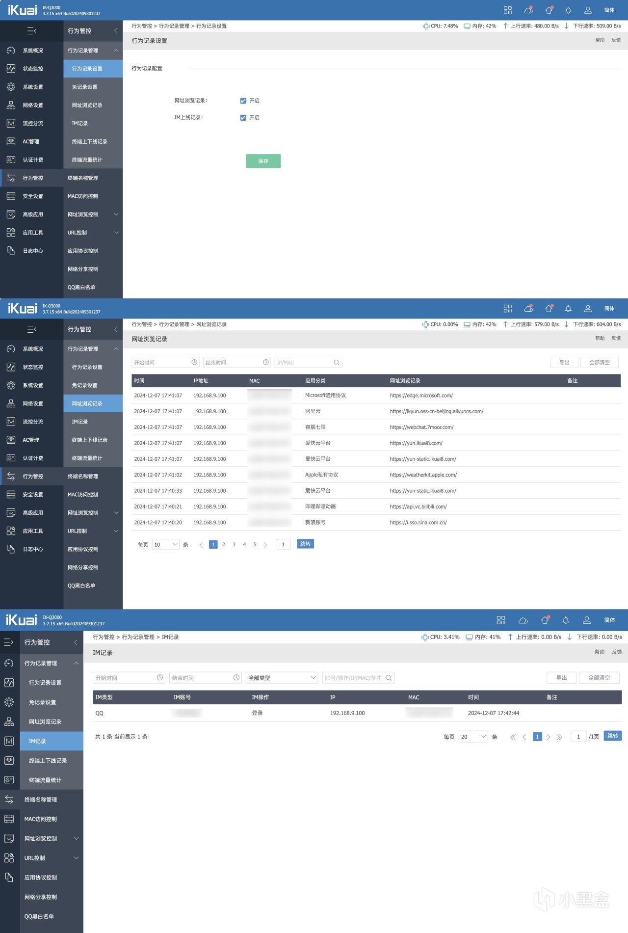 除了端口外,在行为管控中,可以开启网址浏览记录和IM上线记录(聊天软件上线记录),之后就可以看到各个终端的网页浏览和聊天软件上线记录,网址浏览可以精确到域名,聊天软件可以看到具体的账号。
