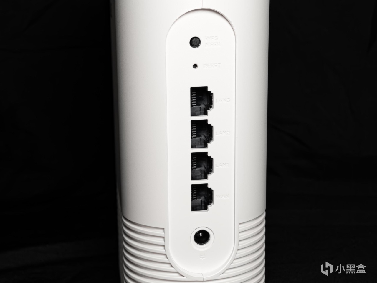 接口则被放在了后侧面,从上到下依次是WPS Mesh按钮、Reset重置复位孔、3个LAN口、1个WAN口、DC电源接口,4个RJ45有线网口均为千兆规格。