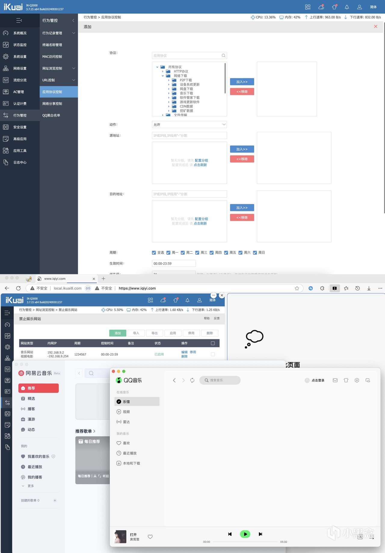 iKuai Q3000支持对网址浏览、应用协议、URL、MAC访问等进行控制,同样已经预置好了几乎所有常用协议、网页数据,你只需要选择分类设置就可以导入。