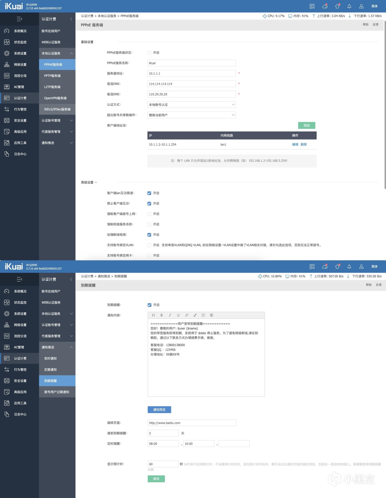 此外,还提供了PPPoE、PPTP、L2TP等服务端的本地认证功能,也就是下级用户需要用户名密码拨号才能联网。