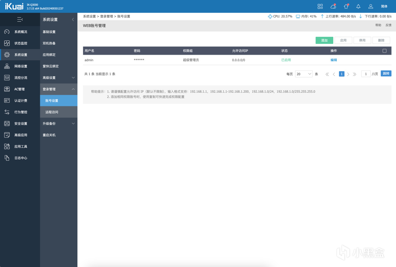 作为企业级路由,iKuai Q3000的后台管理账户都可以设置多个,以便精准给予不同人员权限,日志溯源追责。