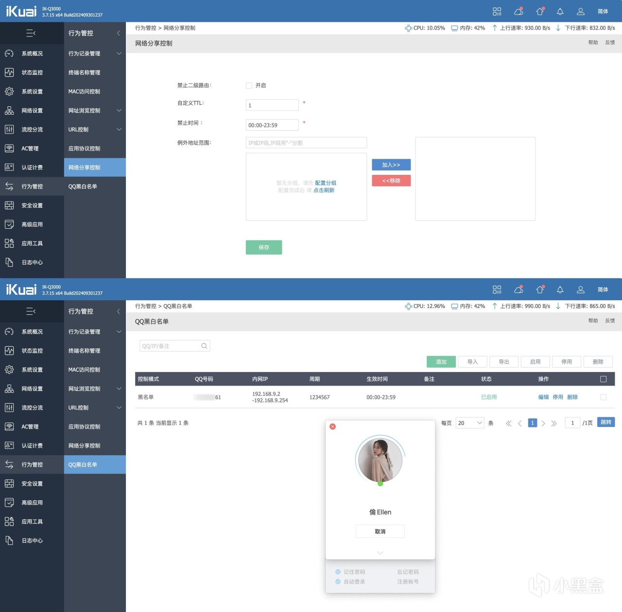 前面看到iKuai Q3000可以检测IM的上线记录和账号,对QQ来说也可以精确到账号进行管控,比如当你家里电脑、平板是公用的,但不希望孩子用QQ,但自己有需求,就可以创建黑名单或白名单限制账号登录。