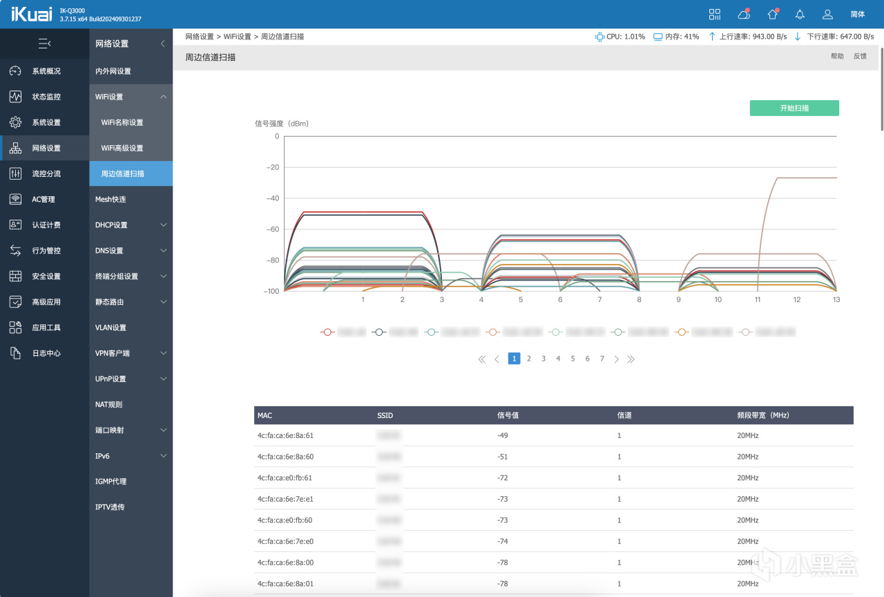 无线信号上,在校园宿舍楼Wi-Fi密度大且学校有部署大量AP干扰的情况下,iKuai Q3000依然比我之前用的newifi mini信号更强。