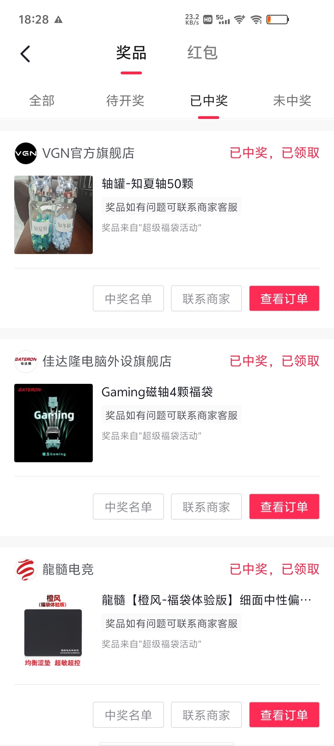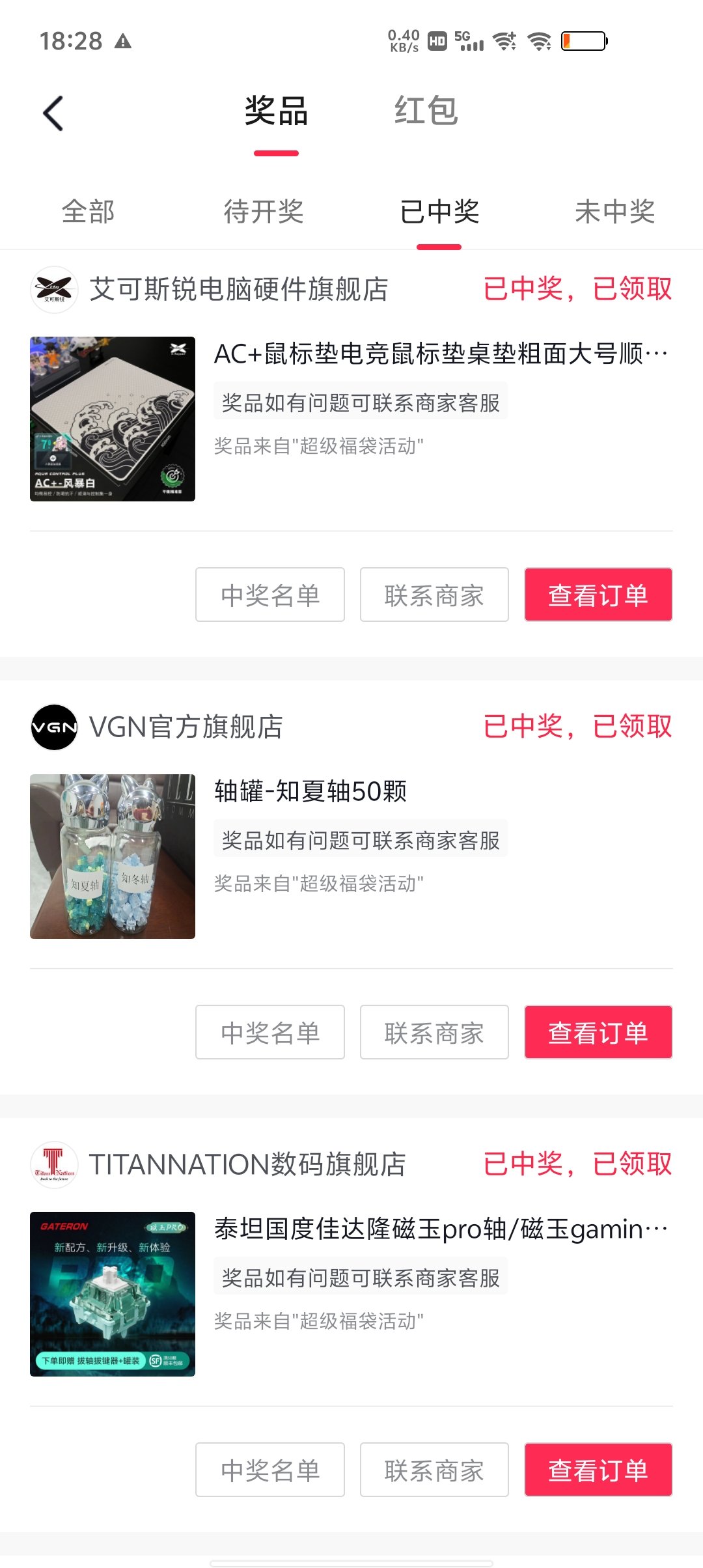 他家的磁玉 pro/gaming 超容易中,每次抽奖才几十个人参与。还经常抽无极(类零)/无畏(类 99)鼠标垫,我都中过好几次啦