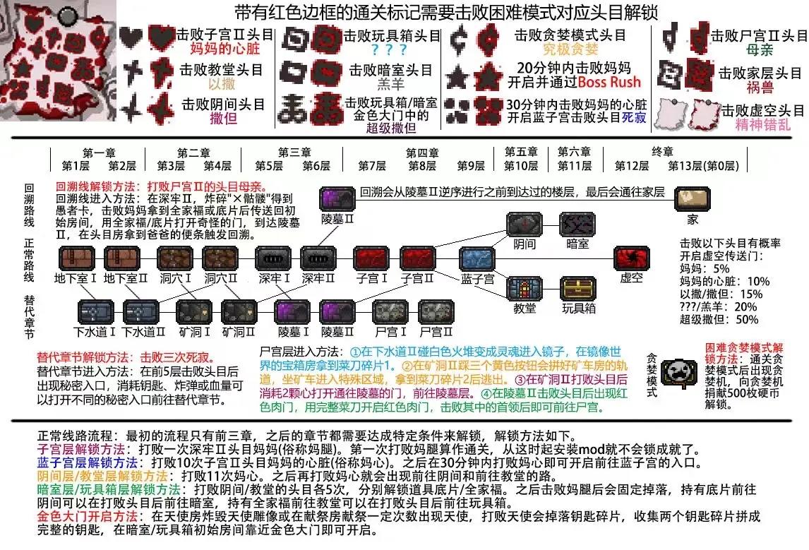 注:擊敗媽媽的心臟11次以後,第8層的首領房中的首領會變爲它還活着,擊敗它還活着之後纔會出現天堂與地獄的通道。(媽媽的心臟與它還活着俗稱都是媽心)