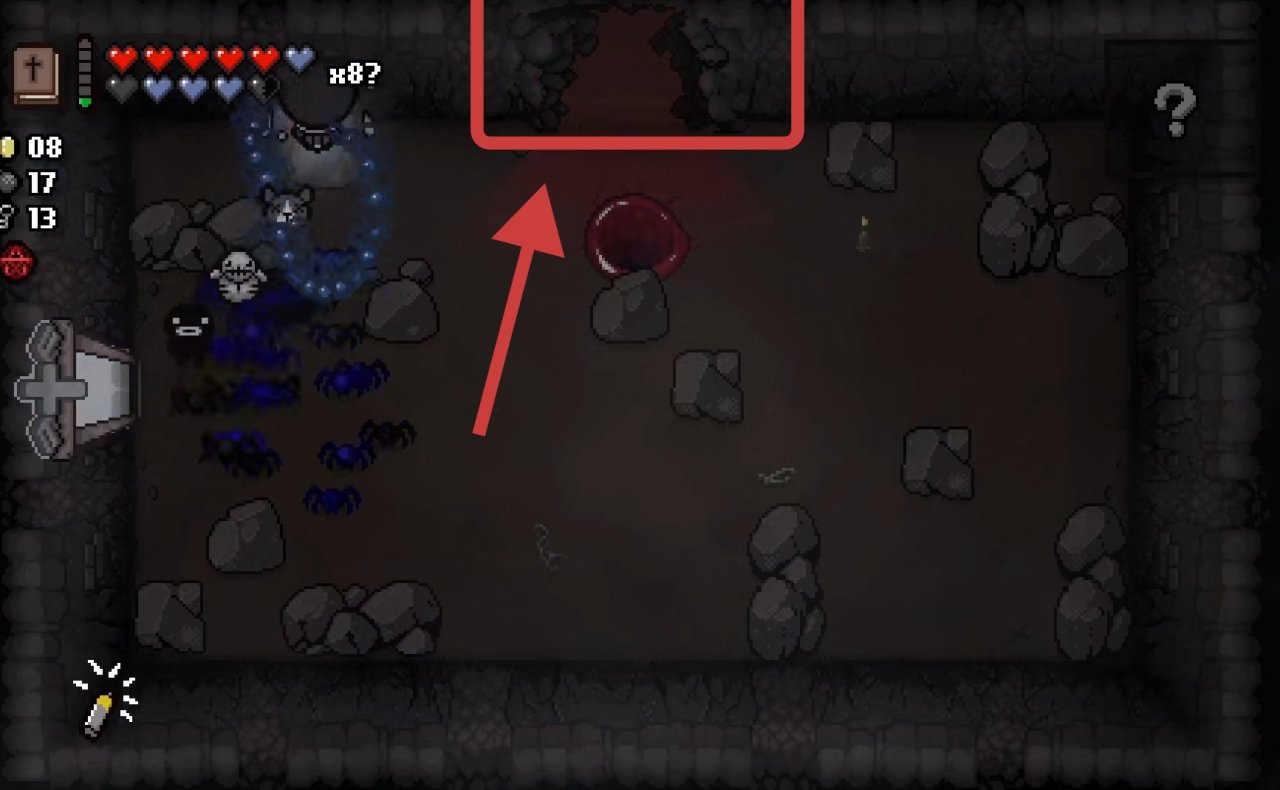陵墓1層也就是墮化媽腿層,必定刷新一個帶x標記的骷髏頭,炸掉之後掉落一張愚者卡牌讓你可以打敗媽腿之後回到初始房間。