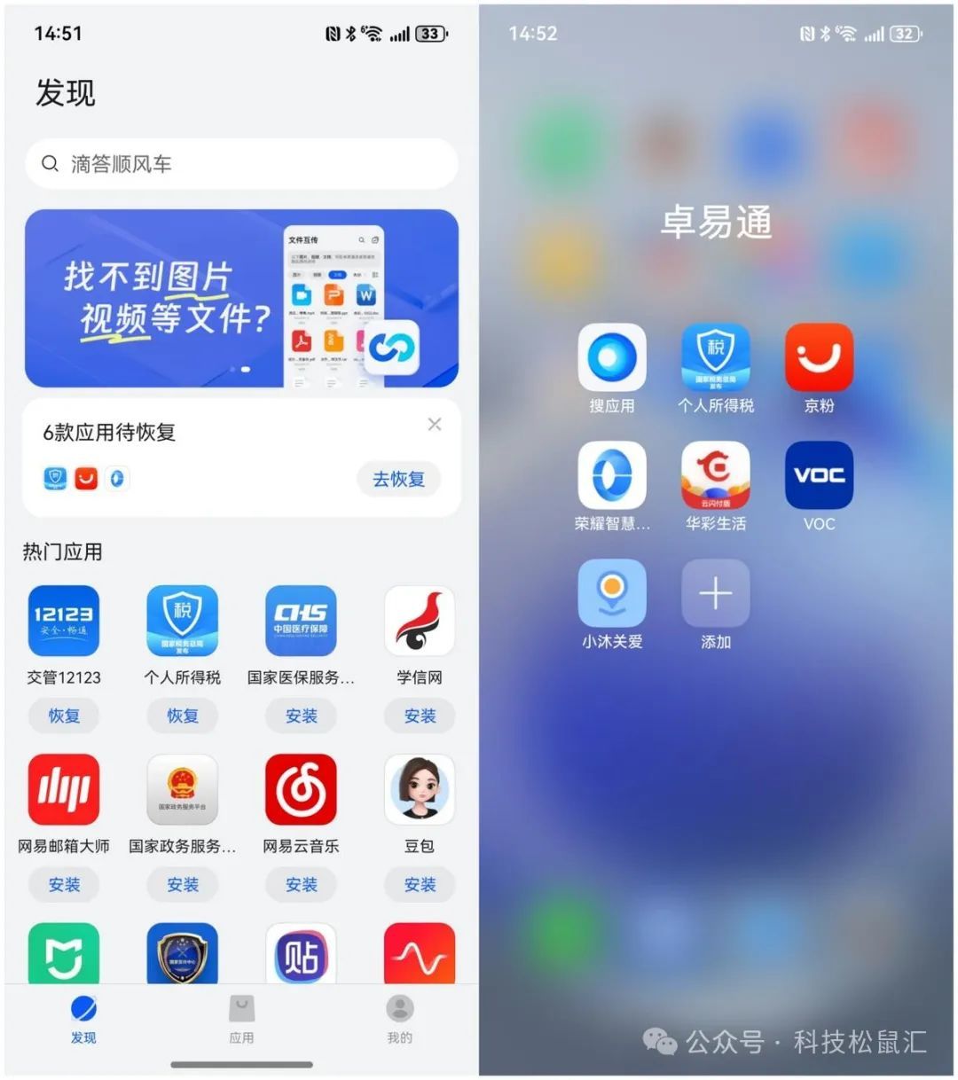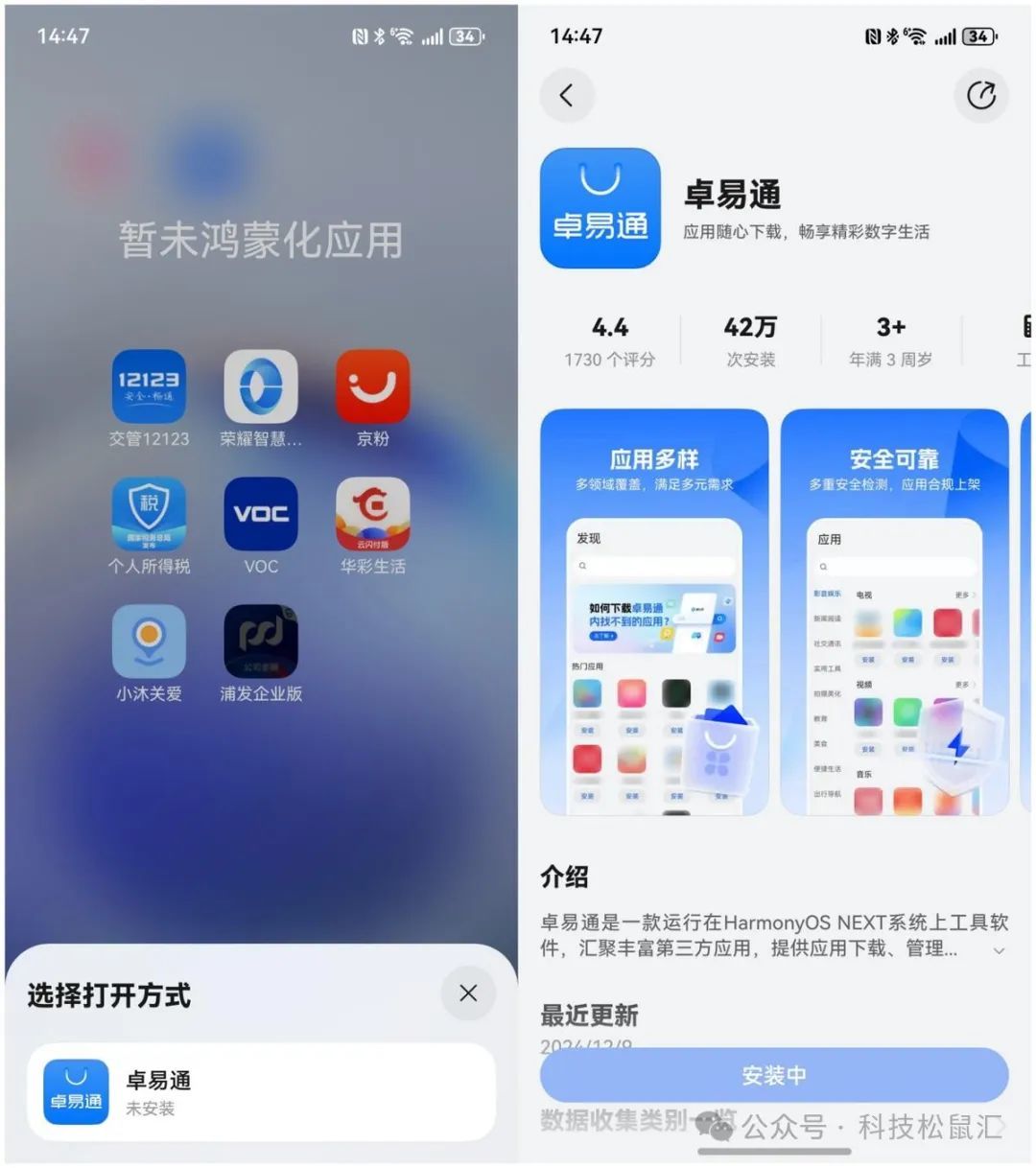 升级后那些未鸿蒙化的应用会被放在一个文件夹里面,点击后弹出“卓易通”,安装后可以恢复那些未鸿蒙化的应用,我有8个未鸿蒙化的应用,恢复了7个。“卓易通”恢复的应用打开和运行也比较流畅,整体的体验和鸿蒙4.2上没啥区别,但对比原生鸿蒙应用,体验方面确实要欠缺一点。
