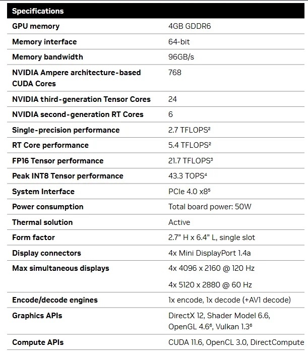 768 個 CUDA 核心、4GB GDDR6 顯存、64bit 的位寬,總線接口爲 PCIe4.0x8、基礎頻率爲 1417MHz,最高頻率爲 1762MHz。