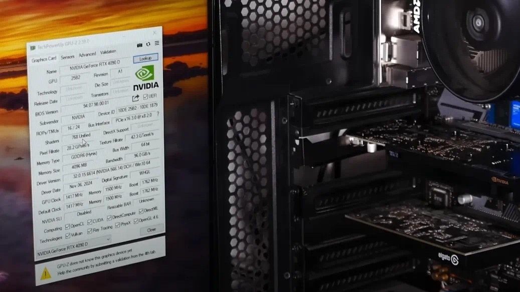 上機後在GPU-Z中毫無疑問是無法正常識別的,而打上 GeForce驅動後,GPU-Z直接顯示是一張RTX4090D,好傢伙,這直接賺麻了不過再往下一看立馬也就露出馬腳了