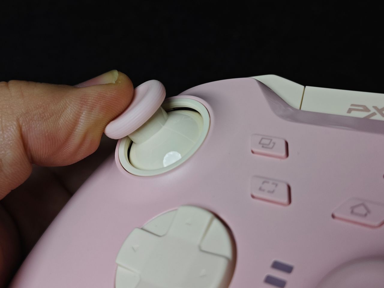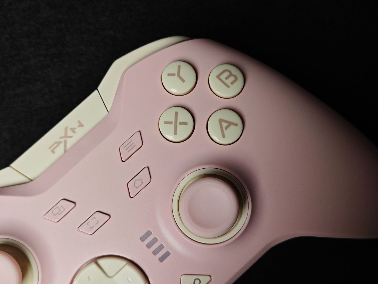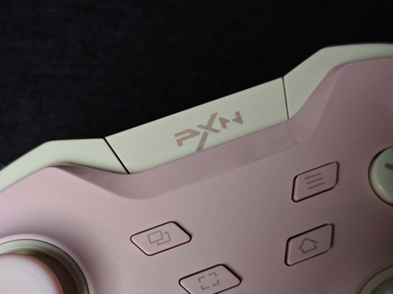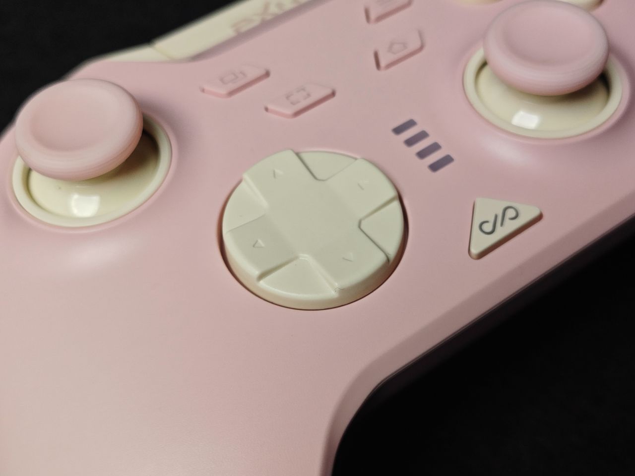 手柄一共有三个配色:骑士黑、耀月白及白桃粉。我手上这款是白桃粉的配色,配色主要以粉色及奶白色为主。手柄面壳做了细磨砂处理,摸上去非常丝滑,面盖上下边框位置均做了一条亮面的饰带,让手柄看上去线条更加立体,肩部独立于面壳,单独做了开模,拼色的处理,让手柄看上去更显设计感。第一眼看上去有让人眼前一亮的感觉。