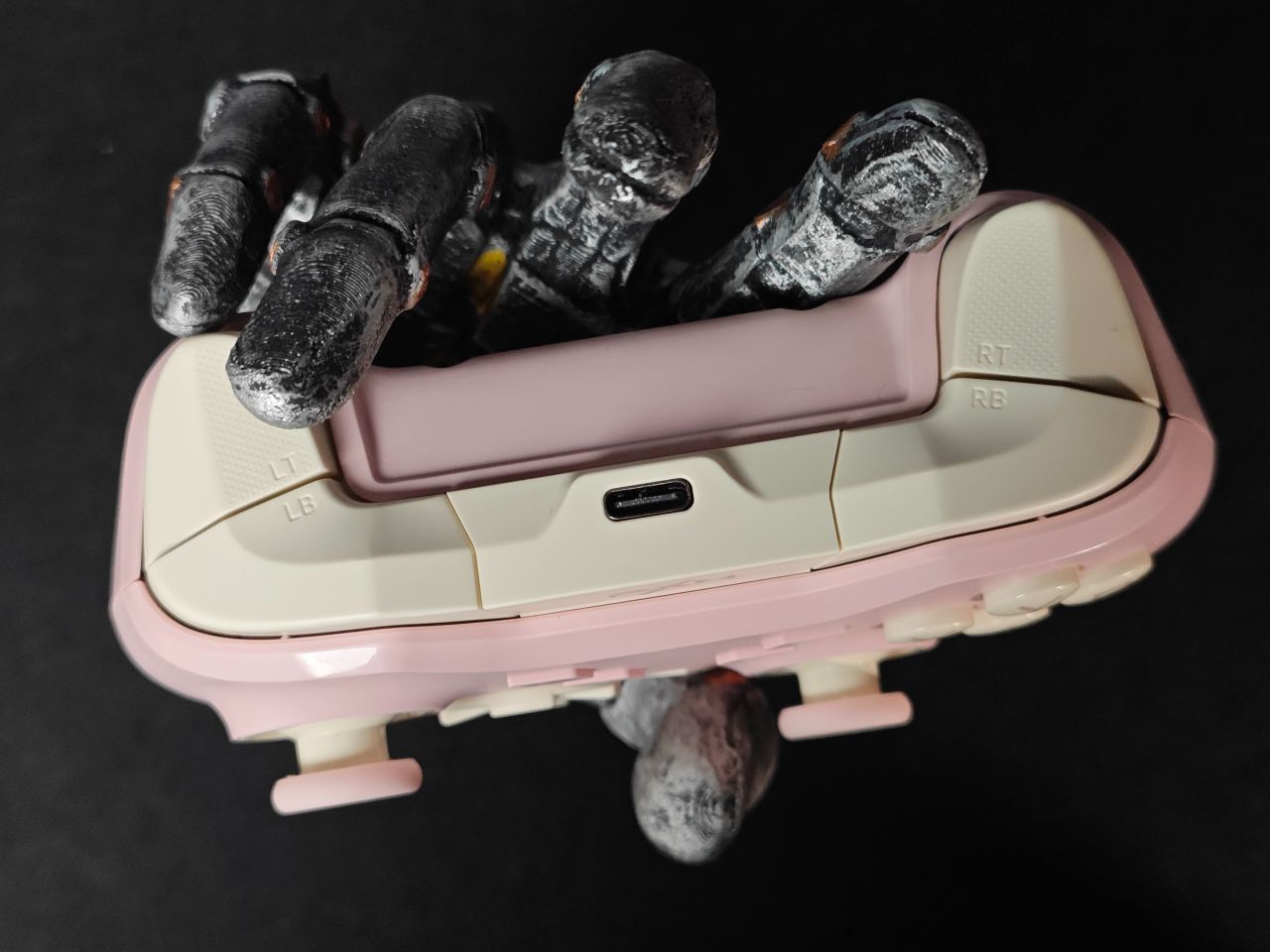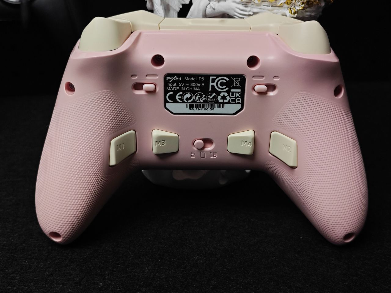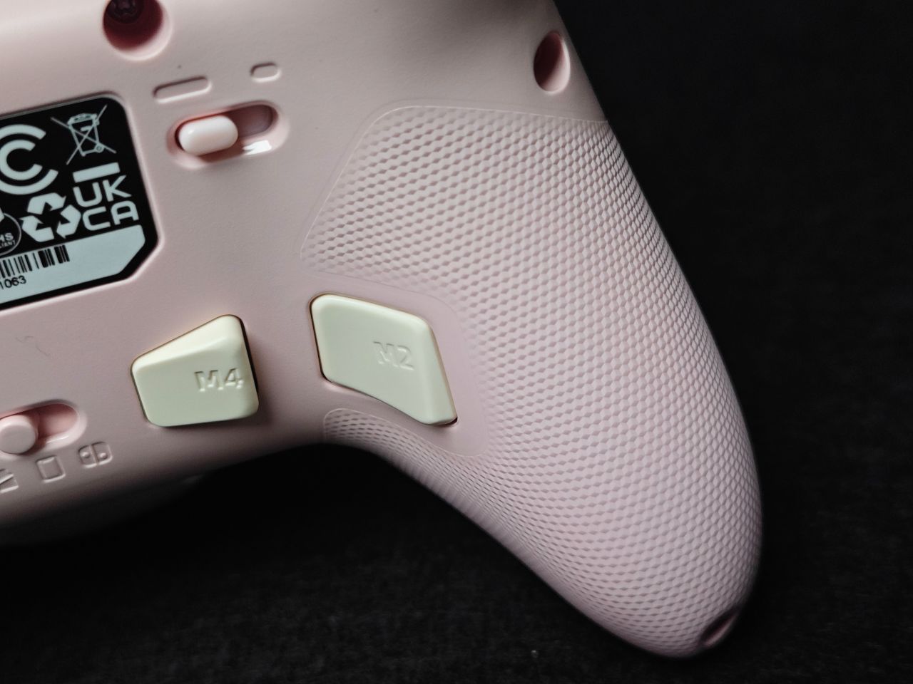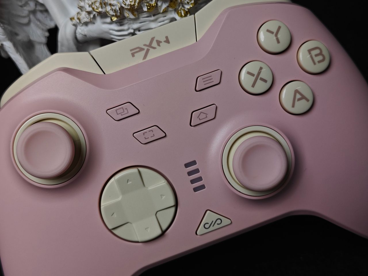 手柄一共有三个配色:骑士黑、耀月白及白桃粉。我手上这款是白桃粉的配色,配色主要以粉色及奶白色为主。手柄面壳做了细磨砂处理,摸上去非常丝滑,面盖上下边框位置均做了一条亮面的饰带,让手柄看上去线条更加立体,肩部独立于面壳,单独做了开模,拼色的处理,让手柄看上去更显设计感。第一眼看上去有让人眼前一亮的感觉。