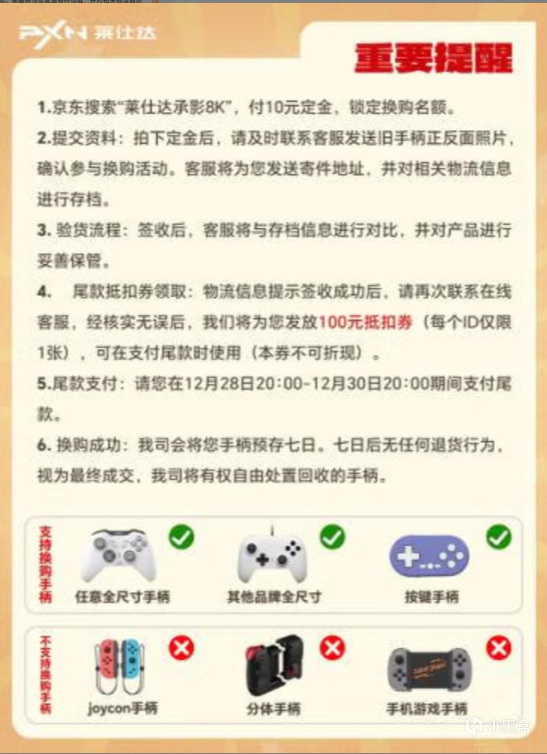 但是,但是,莱仕达上线了一个任意全尺寸手柄99元换购的活动,我问客服要了一个规则详情,感觉应该确实是任意全尺寸手柄都行,如果你手上确实有一个用了很久,很破想稍微换一下的是可以考虑一下,99嘛,三模手柄还要啥自行车。我反正准备把16年买的那个包浆有线北通手柄99换购一个试试。