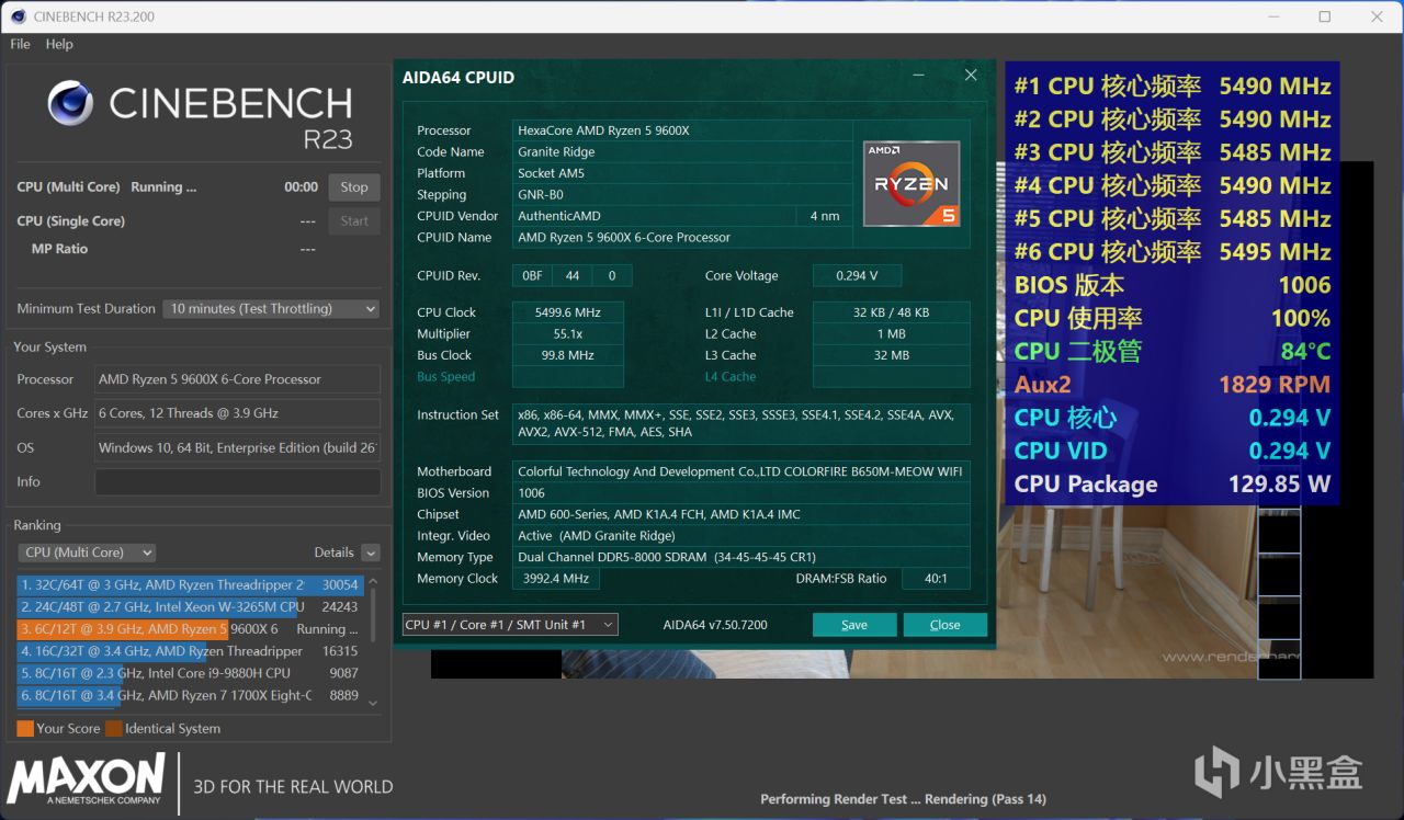 CPU方面,使用PBO 2和CO负压值进行简单调试,9600X显然对于B650M-MEOW WIFI小菜一碟,130W运行功耗就能稳住5.5GHz,在360水冷压制下CPU温度也只有84℃,按照这样的表现,这款主板后续显然还可以锐龙7甚至锐龙9级别的处理器。