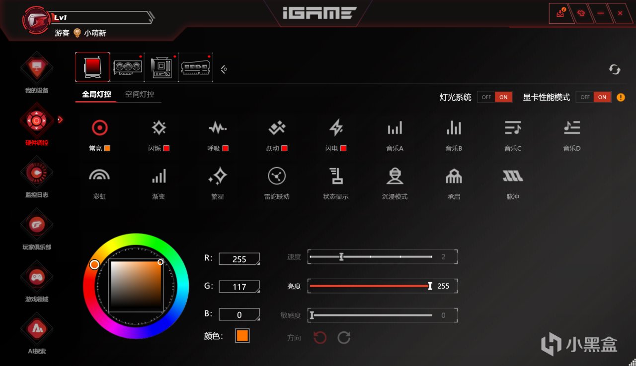 所有灯光效果都可以在iGameCenter中控制,全局灯效就多达17种还是挺丰富的,还可以单独控制各个支持ARGB的硬件。另外这款软件除了拥有显示硬件信息、监控日志等功能,还把玩家俱乐部(产品注册)模块集成在内。