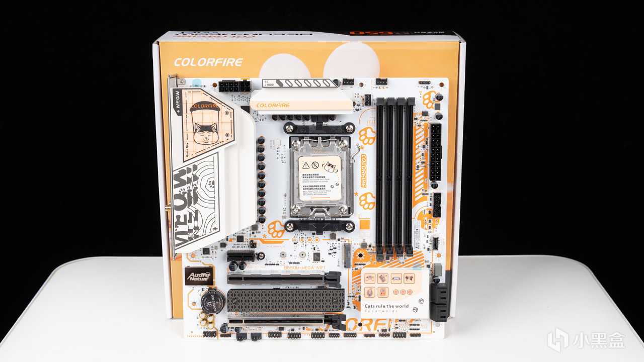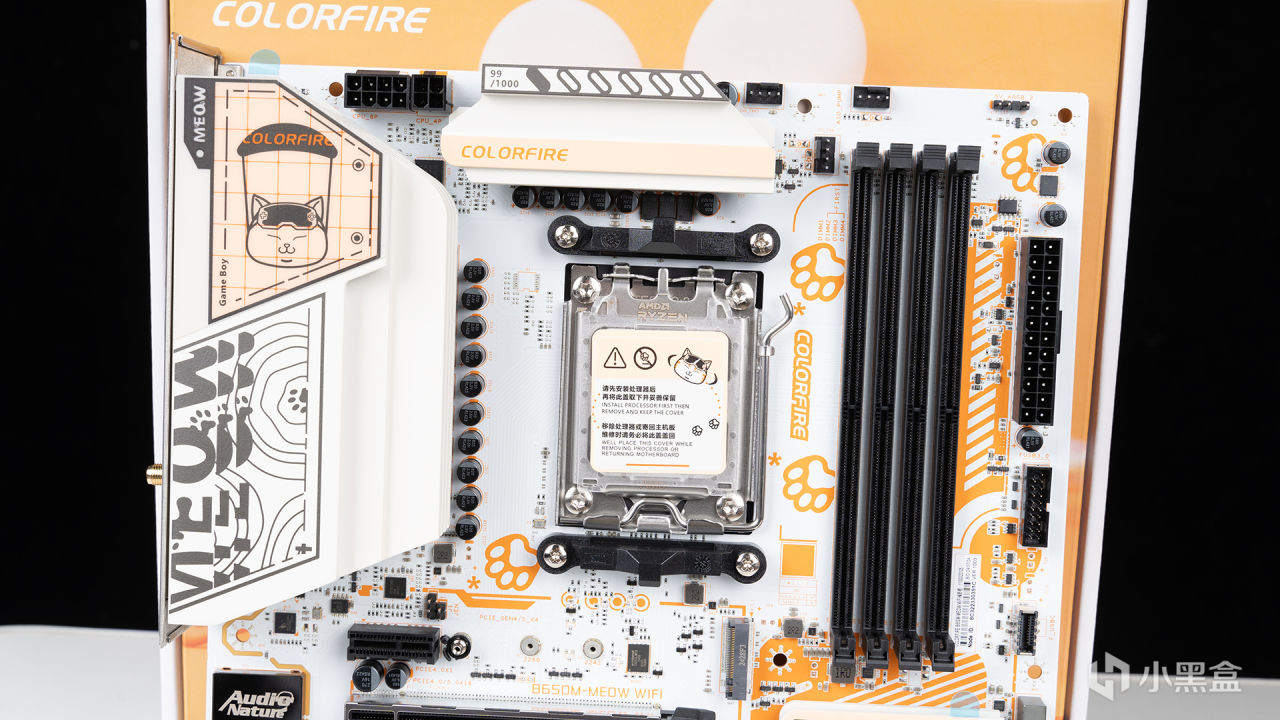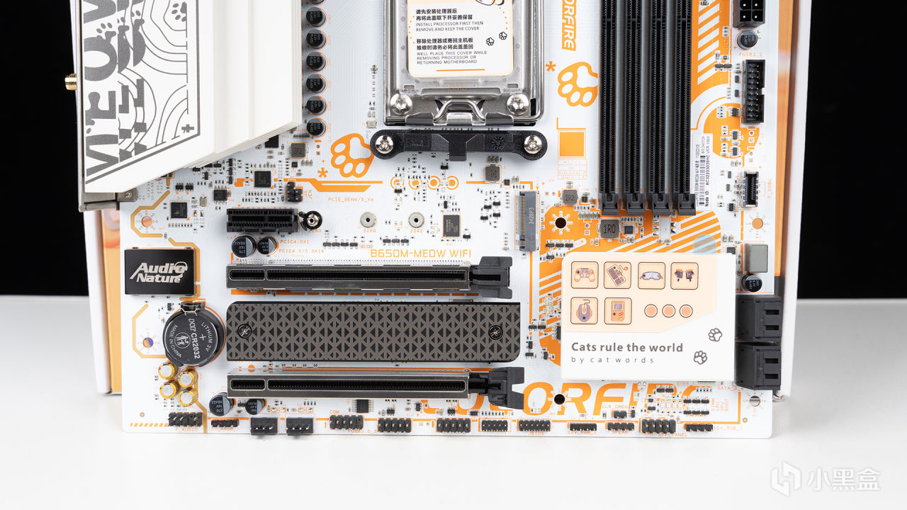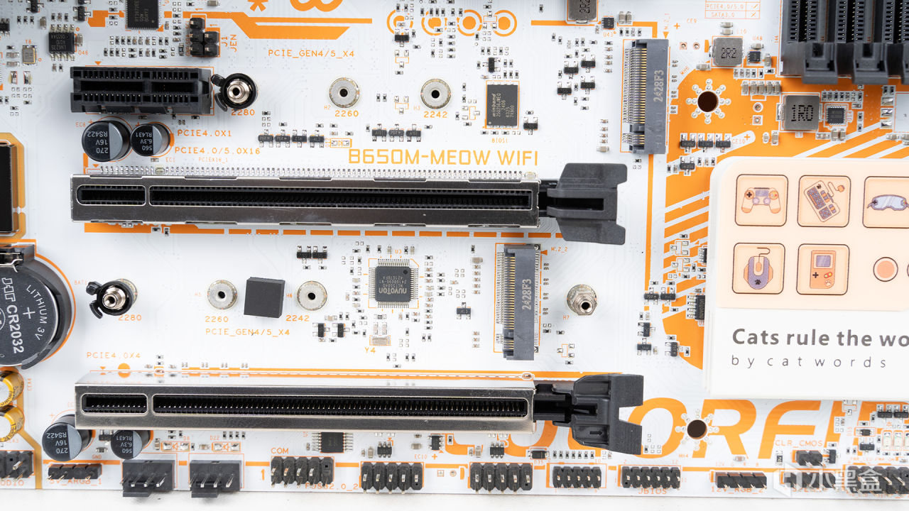 B650M-MEOW WIFI橘影橙整体设计,PCB是纯白打底,并融入了大量橙色猫爪元素和线条装饰,I/O和PCH装甲上也有对应的橘猫和游戏装备相关元素,细节到插槽保护盖也是橘猫贴纸!加上MATX本身就属于紧凑类型主板,添加的元素都会显得尤为突出,妹子看了第一眼也觉得颜值在线。