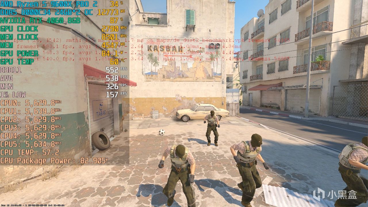 9600X PBO 2+DDR5 8000C34 24GB*2+RTX 4060 8GB,平均帧数538fps,1% LOW帧157fps