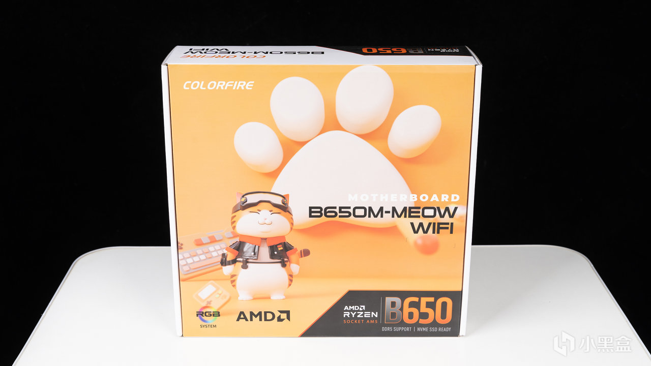 七彩虹B650M-MEOW WIFI橘影橙包装设计,正面以橙色为主调,除了猫爪/橘猫印花、主板型号以外,并没有显露具体卖点,特意放大了猫爪印花是有效做法,第一眼就让人感觉到亲和和可爱。这款主板也支持四年个人送保,比御二家多一年多份保障。