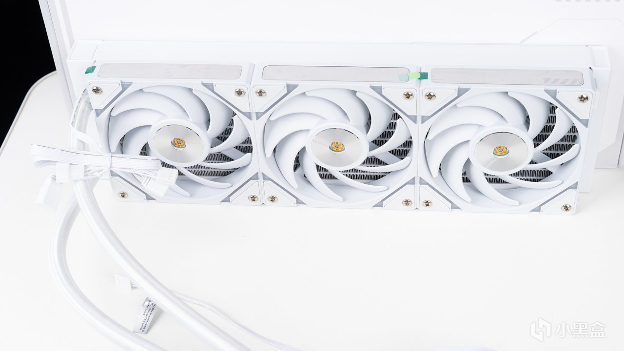 积木冷排扇,正面四角有对称式灯效,侧面有无限镜区域,并且支持编程,性能方面轴心有铜套加持并经过100%动平衡校准,运行更安静稳定,最大转速可达到2200RPM±10%。