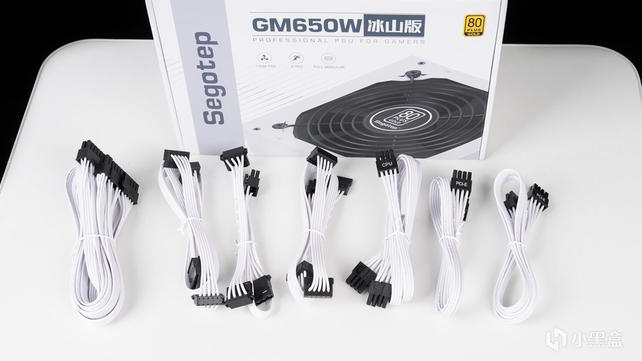 电源配备的扁平模组线,模组线包括1*24pin供电、1*8pin转双8pin CPU供电、2*8pin PCIe显卡供电、3*SATA/HDD这些类型,已经能满足中端配置的需求,后续升级CPU和70系显卡也能匹配得上。