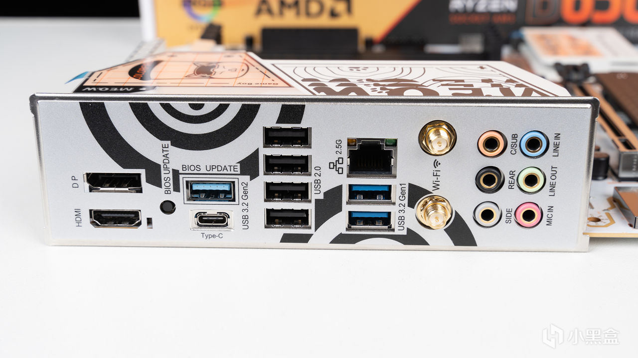 B650M-MEOW WIFI橘影橙的I/O接口,在千元价位中也是相当能打,从左到右分别是1*DP 1.2、1*HDMI 1.4、BIOS更新按钮(无U刷)、1*USB 3.2 GEN 2 Type-C+Type-A(10Gbps)、4*USB 2.0、1*2.5G有线网口(RTL8125)、2*USB 3.2 GEN 1(5Gbps)、Wi-Fi 6天线(AX200)以及6组音频口。