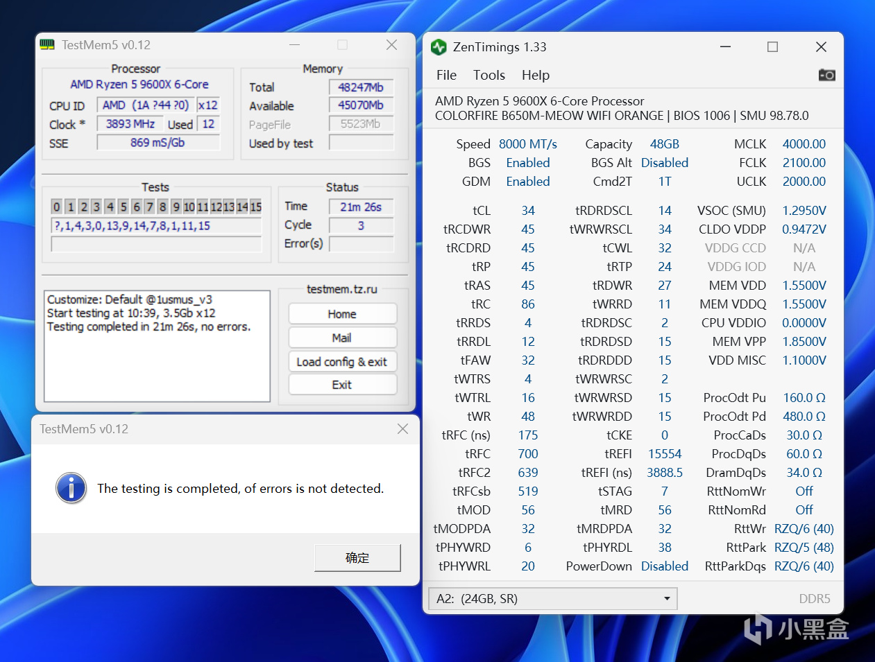 都是硬件老炮了,怎么可能少得了超频环节,经过硬核一阵子摸索,最终把这对金百达白刃RGB DDR5-8000C38 24GB*2时序优化至8000C34-45-45-45,并且部分小参还可以继续收紧,当然收紧程度自然是没有A-DIE大,毕竟也是为了48GB大容量牺牲一点在所难免。