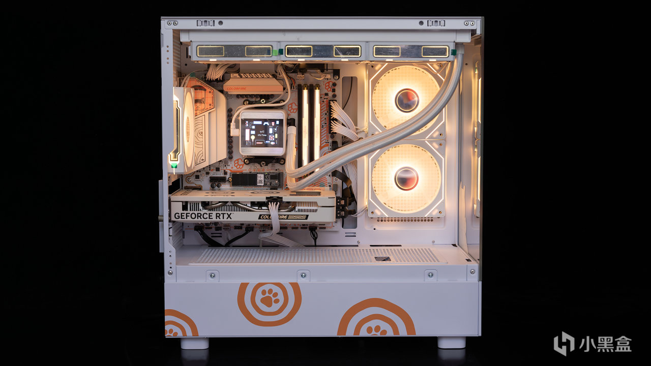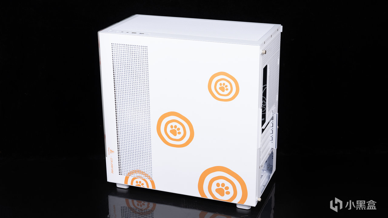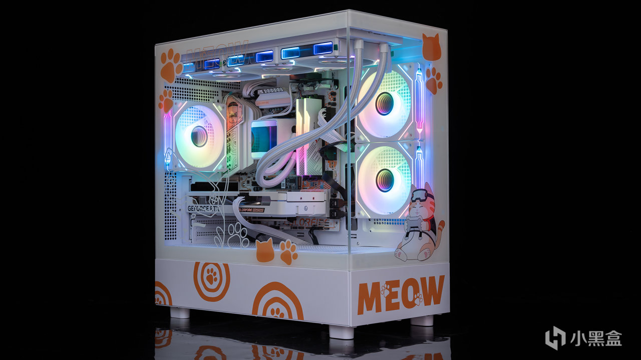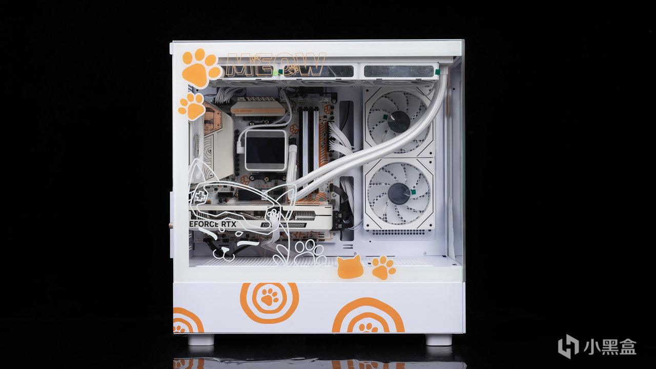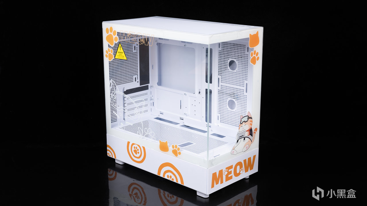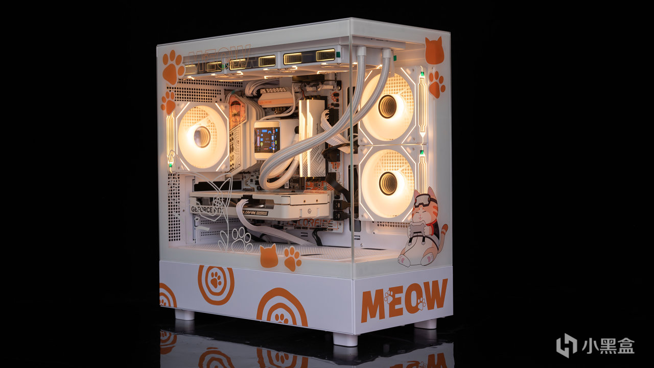 整机完成图,鑫谷无尽Pro+ 橘影橙这款机箱也是依据七彩虹橘猫系列定制的,外观上就设计有橘猫图案、可爱的脚印和MEOW LOGO,机箱结构也属于主流的无立柱海景房,内部硬件可以一览无遗。