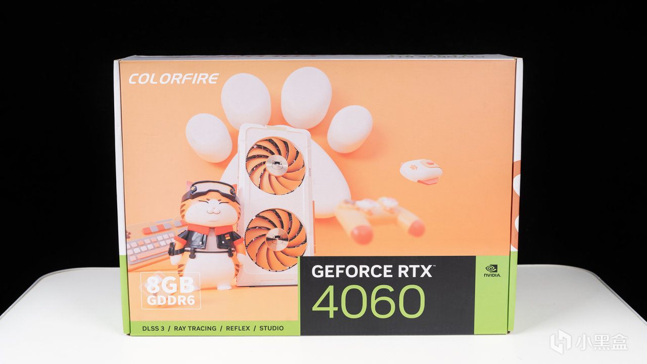 显卡就是GeForce RTX 4060 MEOW橘影橙,包装设计风格和主板类似,唯一区别就是MEOW系列显卡特意把渲染图显露,刚好和橘猫一起竖立摆放两者契合度还挺高~