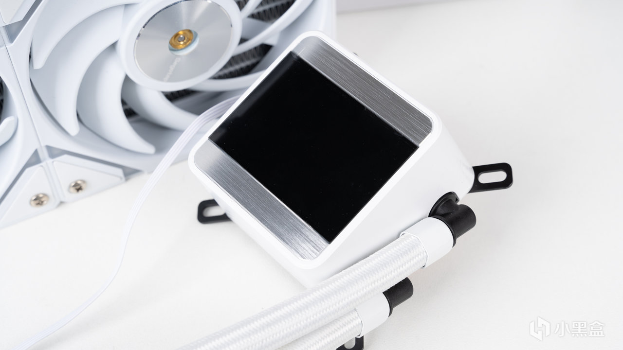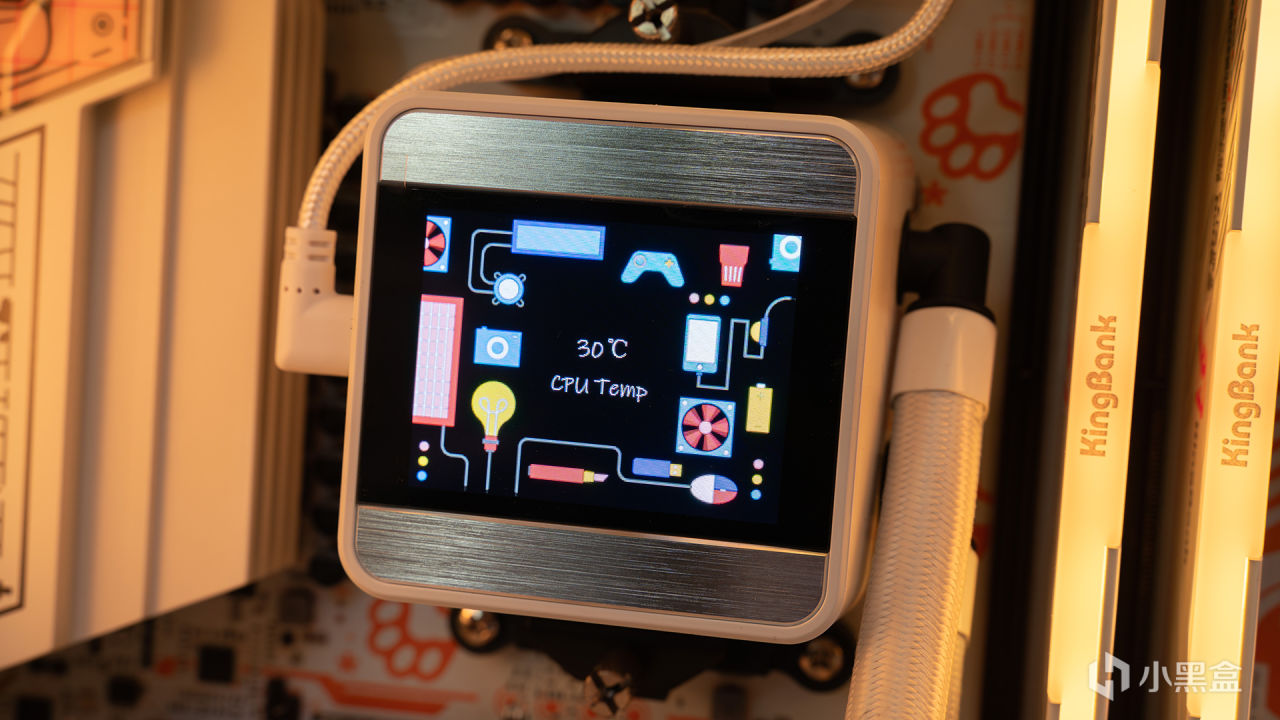 冷头上搭载了2.4英寸IPS硬屏,上下区域有金属拉丝处理,搭配320*240分辨率可最大程度还原图像清晰度和色彩,屏幕支持定制文本、系统信息、背景显示和创新的推流投屏显示。