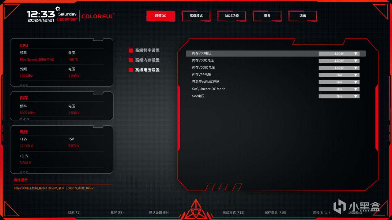高级电压设置,支持PMIC解锁,基本的VDD、VDDQ、VDDIO、VPP以及SOC电压都可以在这个区域进行调节,AMD平台超内存相对也没那么复杂,一般只调VDD、VDDQ和SOC电压也就足够了。