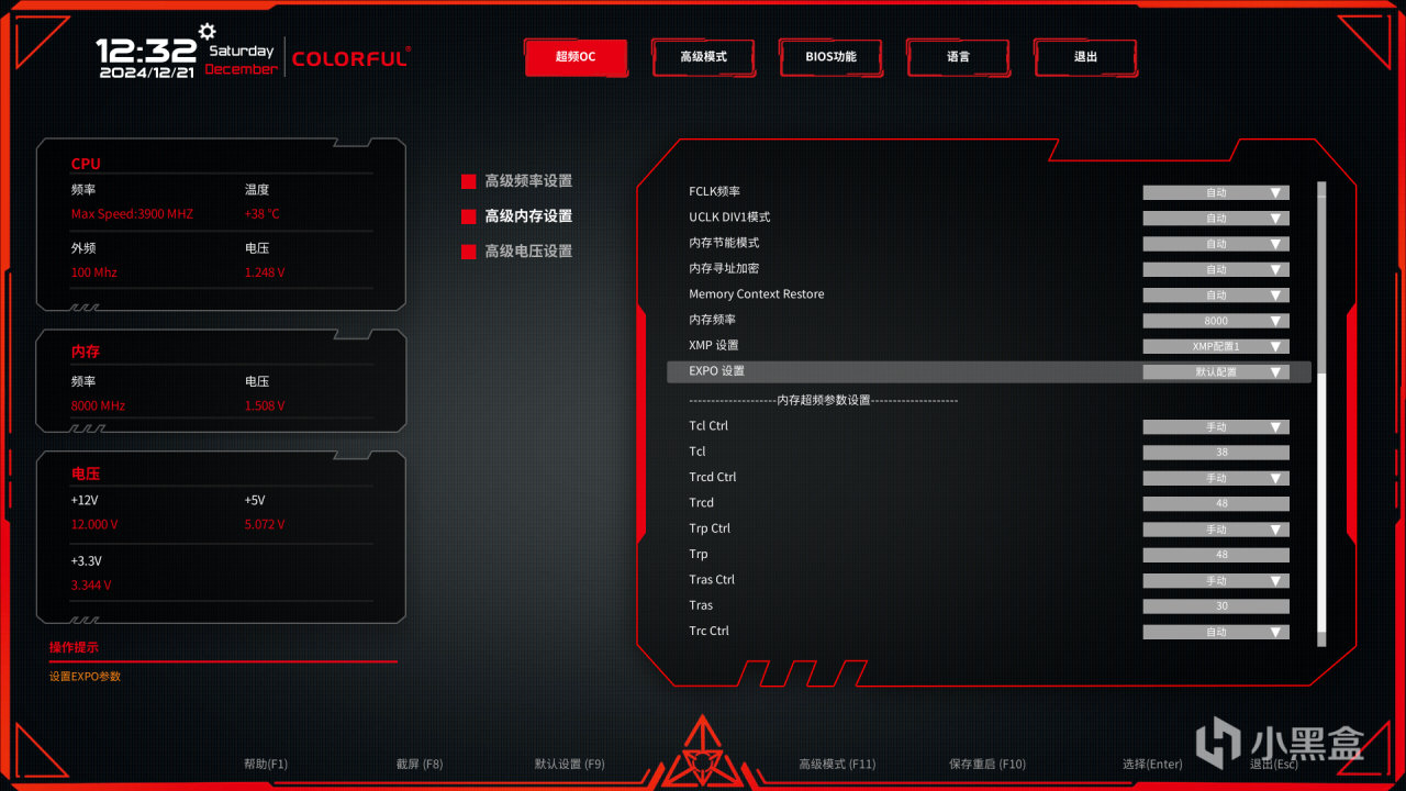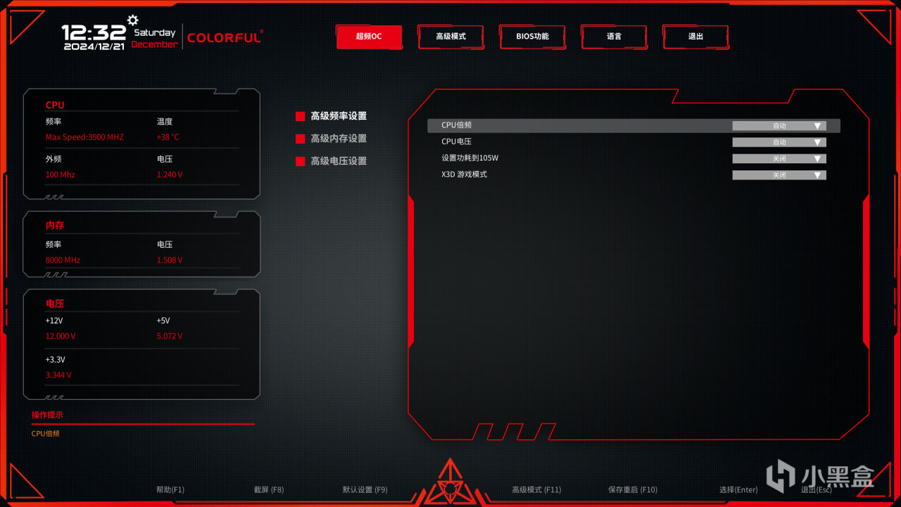 进入高级模式,在超频OC选项高级频率设置中,除了CPU倍频和电压调节,还有105W TDP和X3D游戏模式可选,看起来七彩虹BIOS更新速度也是变快了——和御三家是同一个进度条,这是进步之一。