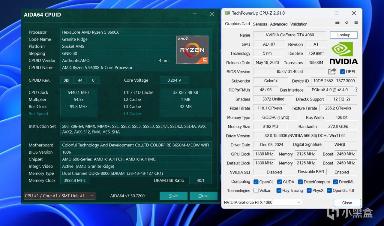 简单介绍一下测试配置和环境,基于Windows 11 24H2最新操作系统下,CPU和内存都直接超频,搭载最新NVIDIA显卡驱动566.36 GameReady WHQL,七彩虹GeForce RTX 4060 MEOW橘影橙开启Resizable RAR技术最大化显卡性能,最近广东也终于大大降温,室温大致18℃左右。