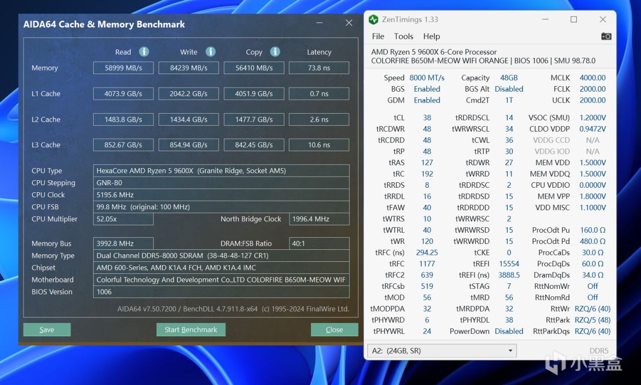 超频至8000C34-45-45-45,AIDA64内存和缓存测试,读取达到63935 MB/s,写入达到87426 MB/s,复制达到62307 MB/s,内存延迟为69.4ns,相比EXPO配置还是有一定提升的。如果对于内存创作一点需求都没,那确实选择A-Die颗粒的6000C28 16GB*2更好一些,但24GB*2的M-Die(3Gb)条子玩游戏就不行了吗?下面一测便知。