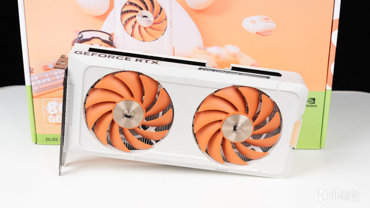 GeForce RTX 4060 MEOW橘影橙正面,搭配了两枚支持风扇智能启停的散热风扇,扇叶也是对应橙色配色,而且轴承之处是亮面+喵星人双重装饰,整体设计符合猫奴心中的印象。整卡长度只有235mm,可适配紧凑机箱,唯一可惜的是本次这款机箱不支持竖插显卡。