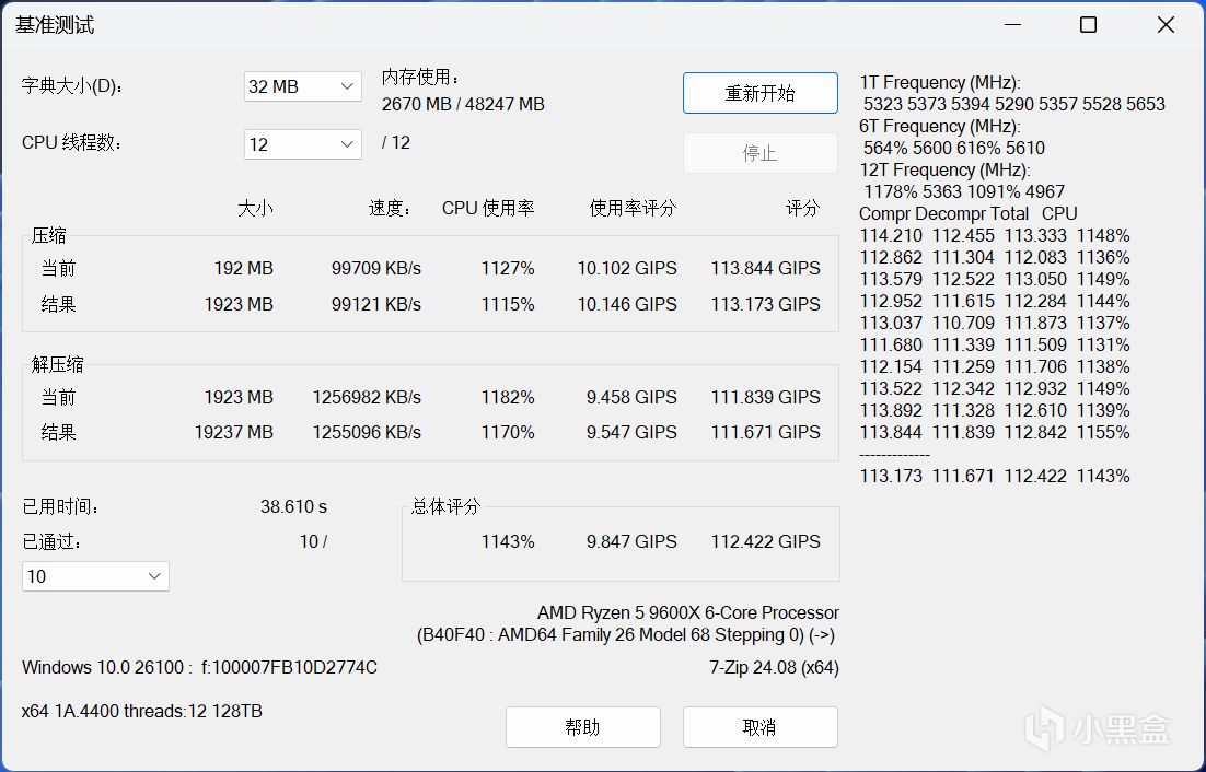 7ZIP解压缩,压缩评分为113 GIPS,解压缩评分111 GIPS,这个项目真是对应妹子需求,日常处理照片都需要进行压缩和解压缩操作,压缩更关联内存性能,而解压缩则是受CPU多线影响,所以适当的稳定调试也是可以提升她的使用体验的。