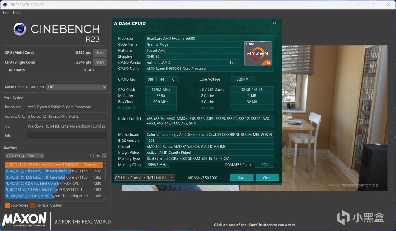 内存和CPU都调试好了,我们就进行跑分吧,在CINEBENCH R23中,9600X使用PBO 2超频后,单核分数达到2246 pts,多核分数则是18280 pts,相比默认AUTO大致可提升7%多核性能和3%,提升幅度相当不错了。