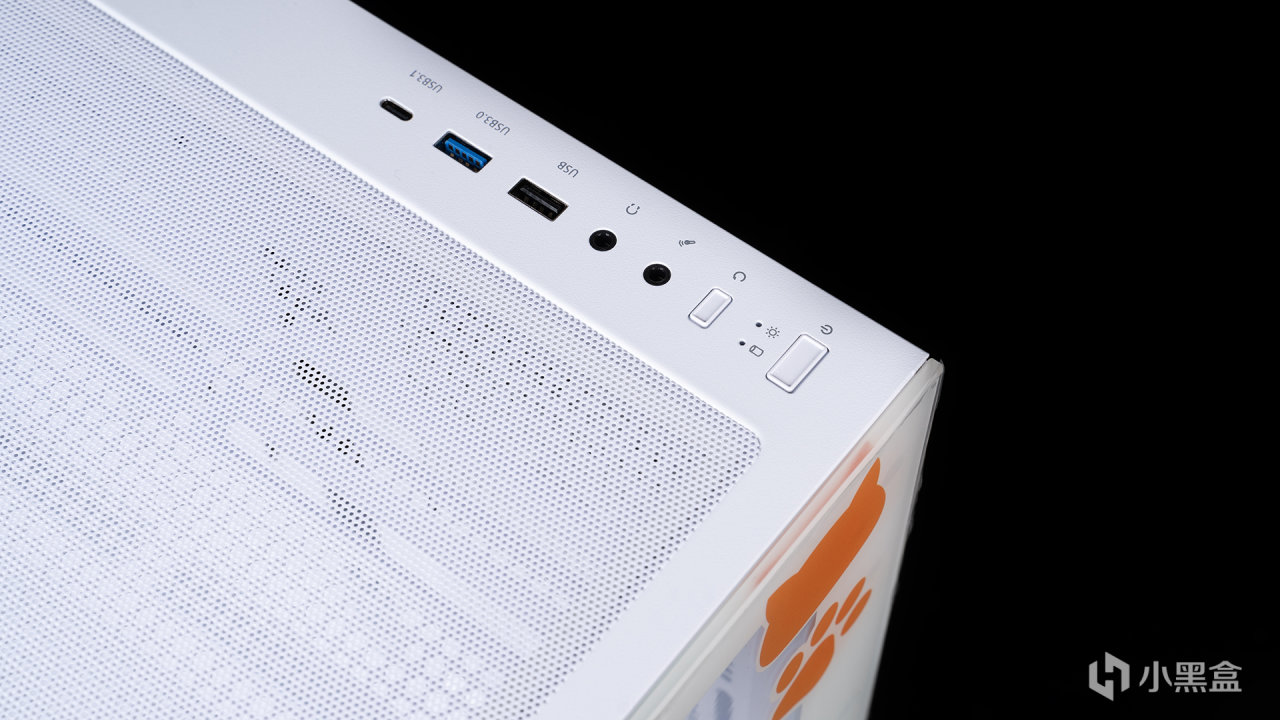 背面其实也有猫爪喷绘区域,不过按照大部分玩家机箱放置方位日常是看不到了,散热开孔区域也有配备防尘垫。