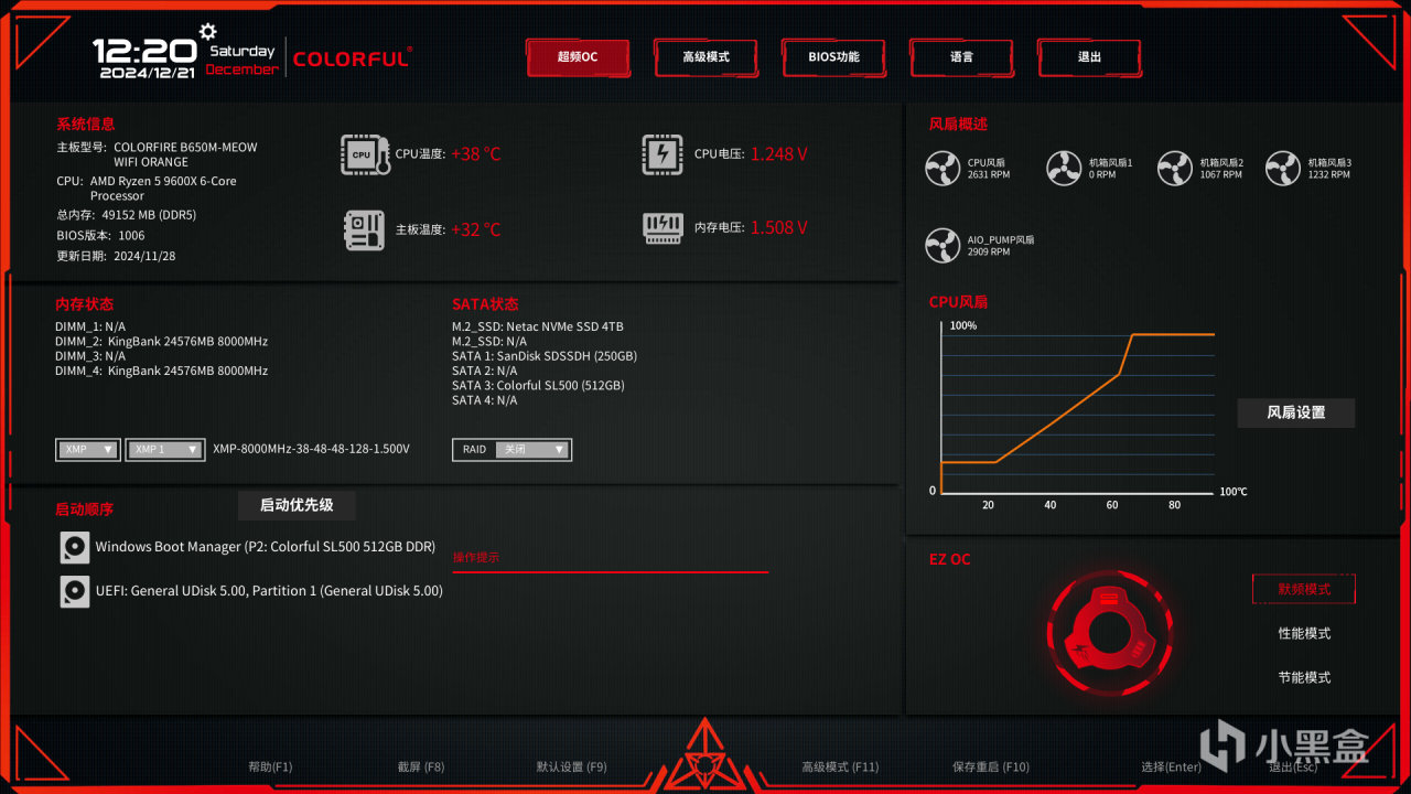 七彩虹B650M-MEOW WIFI橘影橙BIOS界面,进来就是简易模式,大部分主流玩家能用的功能已经集中于此,比如XMP/EXPO、风扇设置、启动服务等。不过BIOS主题仍然是红色的,并不是橘猫背景有点遗憾~