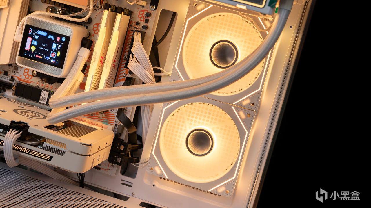 侧面的鑫谷宁镜12反叶风扇,这两组风扇更多是为了降低显卡温度,CPU是没多大关联因为是AIO水冷方案。