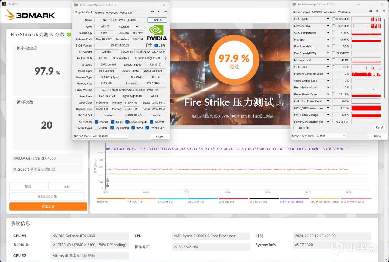 3DMark Fire Strike压力测试,GeForce RTX 4060 MEOW橘影橙最终通过啦为97.9%,相比同型号主流配置来说还是合格的,测试期间GPU最高温度为71.5℃,热点温度则是90℃,能稳定过压力测试性能就是没问题了。