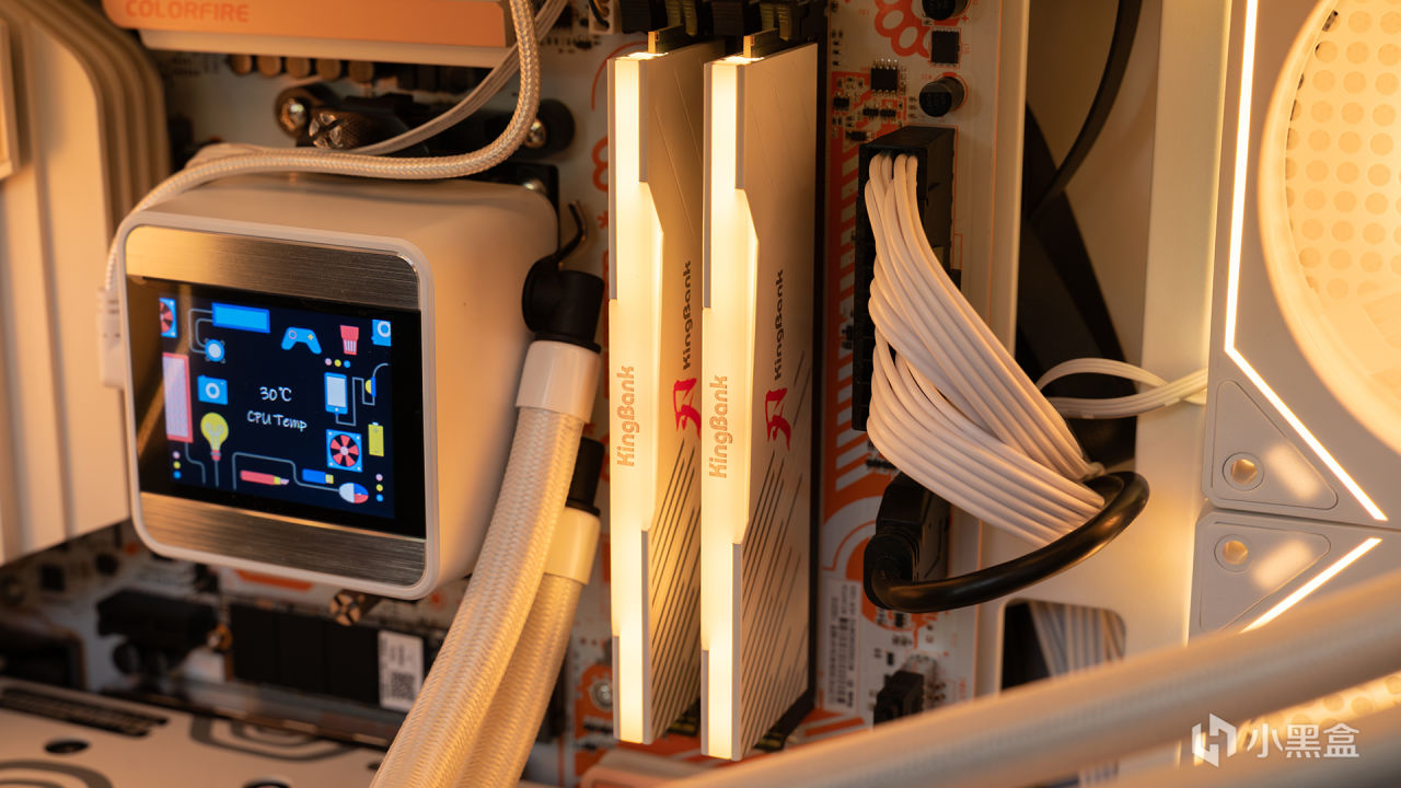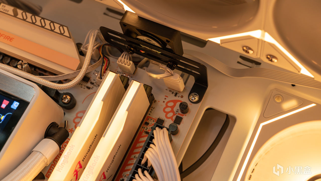 本次还在内存插槽安装了辅助风扇,因为后续测试还会榨干一些性能需要加点电压,稳住散热是必须的,尺寸相对较小且安置在上方,可以完美不遮挡内存灯光效果。