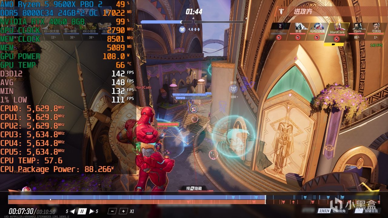 9600X PBO 2+DDR5 8000C34 24GB*2+RTX 4060 8GB,平均帧数148fps,1% LOW帧111fps